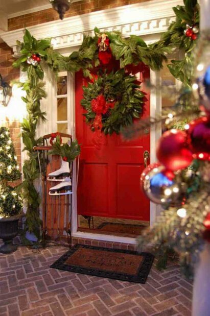 Заграницей, люди привыкли украшать не только интерьер дома, но и внешнюю часть. На входные двери вешают венки из ели, гирлянды, около дома ставят фигуры животных, Санта-Клауса, снеговика и различные атрибуты, которые соответствуют этой поре года.