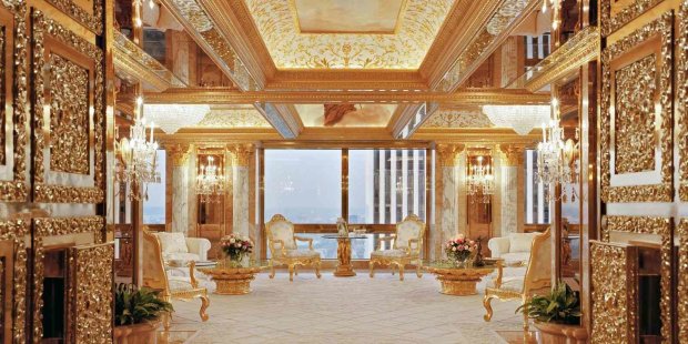 Магнат недвижимости Дональд Трамп живет как король. Кто бы мог подумать? 58 этажей над Нью-Йорком на 725-й авеню. Трехэтажный особняк украшен дорогими элементами декора включая эпоху Людовика XIV, стулья и золотые херувимы.