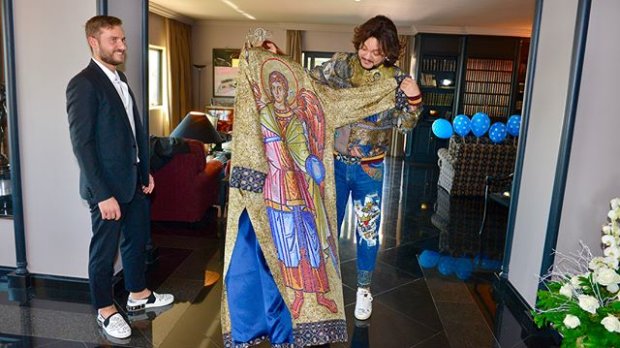 На своей страничке в Instagram Киркоров размесил фото, на которых он красуется в новом бомбере и тунике, расшитыми уникальной росписью. с золотыми пуговицами и с изображениями икон.