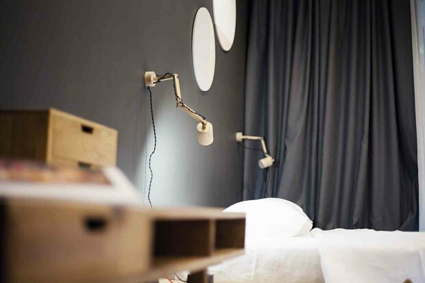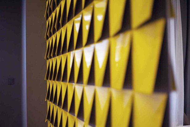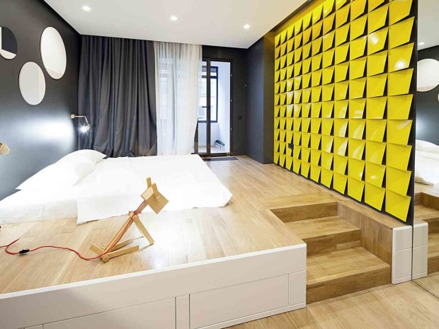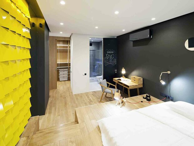 Спальня создавалась по принципу закрытого, самостоятельного пространства, в котором есть максимум необходимого на случай если в гостиной останутся ночевать гости. Желтая стена из гнутых металлических панелей изготовленных индивидуально — является одним из акцентов этой комнаты.