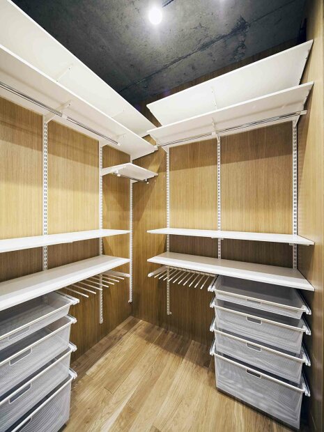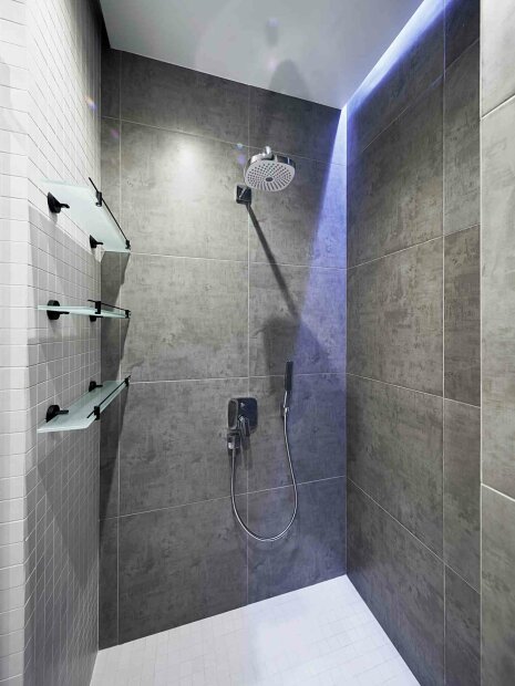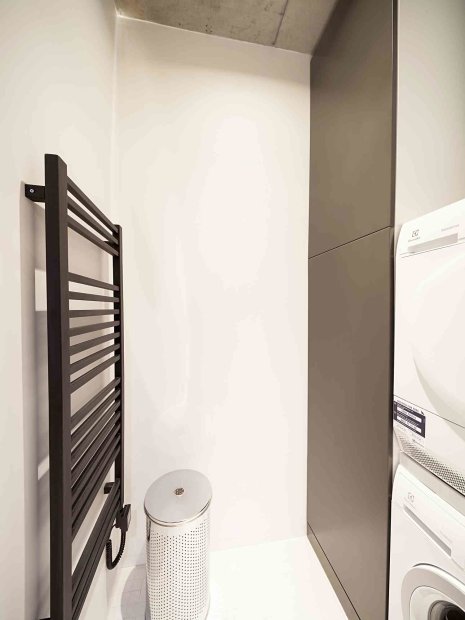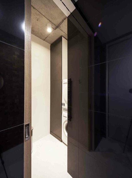 В существующее пространство дополнительно удалось поместить гардеробную комнату для двоих человек, хозяйский блок, где находится стиральная, сушильная машина, а также органайзер для бытовой химии. Вместо маленького хозяйского сан.узла удалось создать комнату в которой есть два умывальника и просторный душевой отсек для двоих с двумя душевыми зонами.