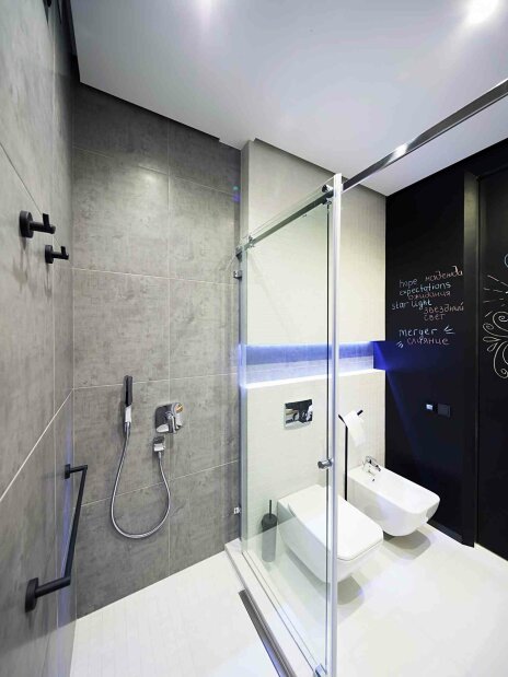 «Задачей было спроектировать функциональное пространство с большим количеством скрытых мест для хранения вещей, в котором было бы комфортно находиться молодой паре, не нарушая личное пространство друг друга. Гости всегда приветствуются, и для них должно быть много места. Никто не должен мешать друг другу.»- подчеркнул дизайнер Илья Таслицкий
