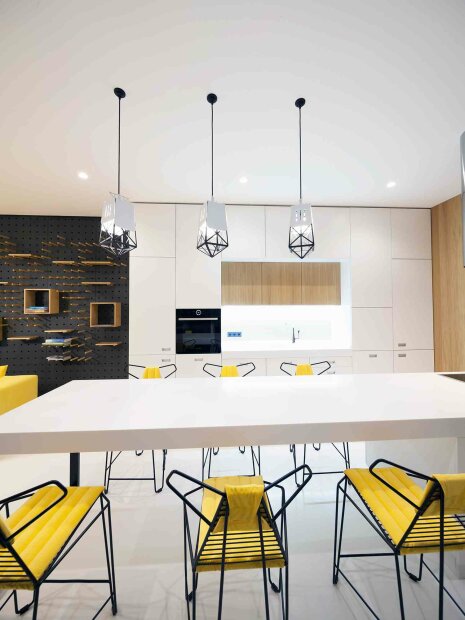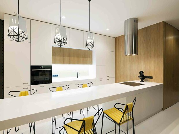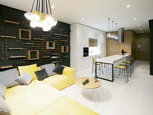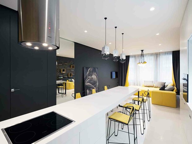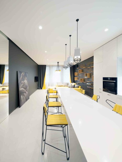 «Одним из основных принципов создания кухни-гостиной является ее многозадачность. В те моменты, когда хозяйке нужно будет максимальное количество пространства – она сможет использовать рабочую поверхность кухни и остров целиком, когда в квартире будет вечеринка – остров превращается в стол для 6ти персон находящиеся возле мягкой зоны отдыха с книжной стеной трансформером.» — отметил Илья Таслицкий
