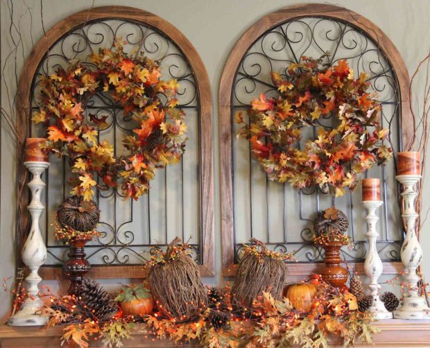 Если говорить о кухне, ты можешь застелить скатерть на стол с ярким осенним рисунком. Если в твоем доме есть камин, ты можешь над ним повесить венок из листьев как на входной двери. В ванную комнату повесь желтые и темно синие полотенца, которые символизируют осень.