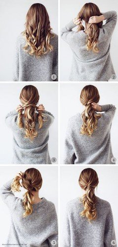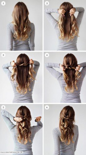 Первым делом завей кончики волос, начеши на затылке и укрой начес прядями с макушки. После зафиксируй ее невидимками. Дальше бери по одной прядке с левой и правой височной зоны и закалывай их шпильками к начесу. Так же собери, красиво уложи в центре затылка и зафиксируй нижние прядки. Должно получиться что-то вроде объемного пучка. Пряди, оставшиеся у лица, скрути в свободные жгуты, уведи назад и зафиксируй с помощью неведимок.