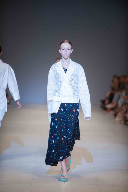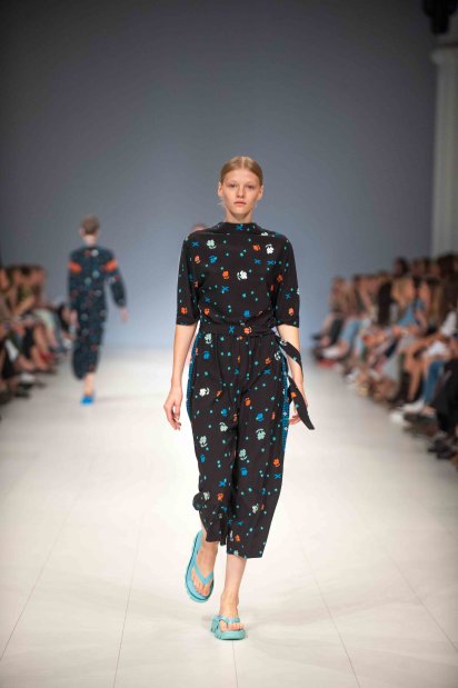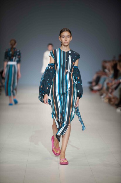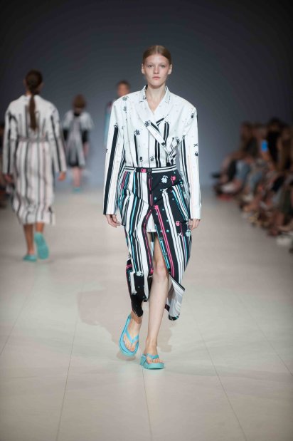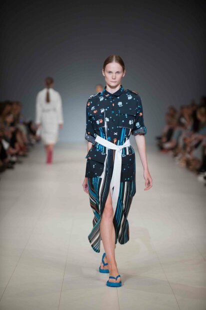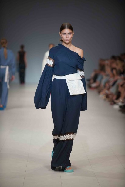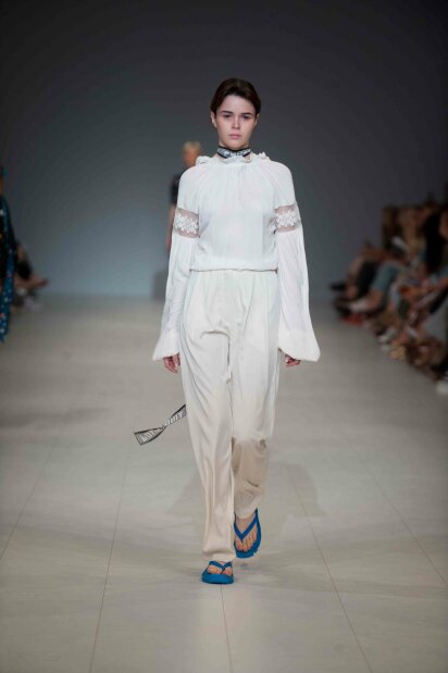Для создания весенне-летней коллекции главным вдохновением послужили крайки — тонкие плетеные или тканые пояса из разноцветной пряжи, которые широко использовались в культуре карпатских гуцул. Вышивку из крайек, чем-то напоминающую собой наивные детские рисунки, дизайнер перенесла на шелковые рубашки, а сами крайки появились в линейке то в виде шлеек на платьях, то в виде завязок на рукавах-колокольчиках, стилизованных под национальные сорочки, то в виде пояса на плащах и юбках.